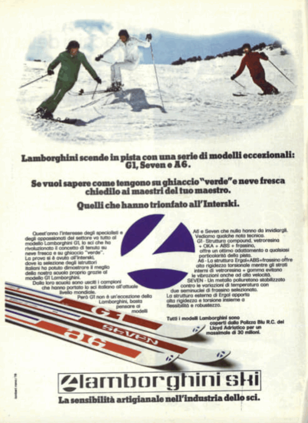 Lamborghini Sci ha rappresentato sperimentazione, evoluzione , prestazioni. Non solo sci ma anche articoli sportivi come il vogatore in legno prodotto dal 1934 al 1947 o gli slittino.